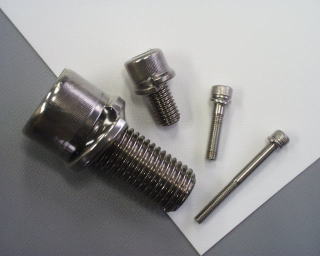 写真は六角穴付ボルトにばね座金をパクト化してみました。写真はステンレスの六角穴付ボルトです。左の2本は全ネジの場合で右の2本は半ネジ(呼び径)ボルトの場合です。上部に六角レンチが入りそのまま締結します。ばね座金だけではなく皿ばね座金や特殊座金にも応用がききます。但し、油があるとパクトの加工性が落ちますので価格的にはメッキ品やSUSのものに優位性があります。キャップは下向きに使用することが多いのでとても便利です。尚、手の入らない作業にはパクト・ドライキャップ2をご利用ください。