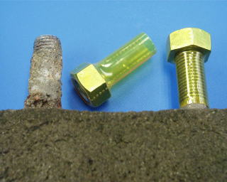 基礎工事でコンクリートを流し込む時アンカーボルトにコンクリートが附着して困った経験はありませんか?現場ではビニールテープを巻いてそれを防いでいる光景をよく見かけます。写真中央はパクト・プロテクトです。ナットの下側にフィルムを長く残し右の写真のようにアンカーボルトにネジ込みます。コンクリートを流し込んでもフィルムが保護してくれるので何もしない写真左のようにはならないのです。コンクリートの養生期間が終わりアンカーボルトの活躍時が来たらフィルムを除去してお使い下さい。
